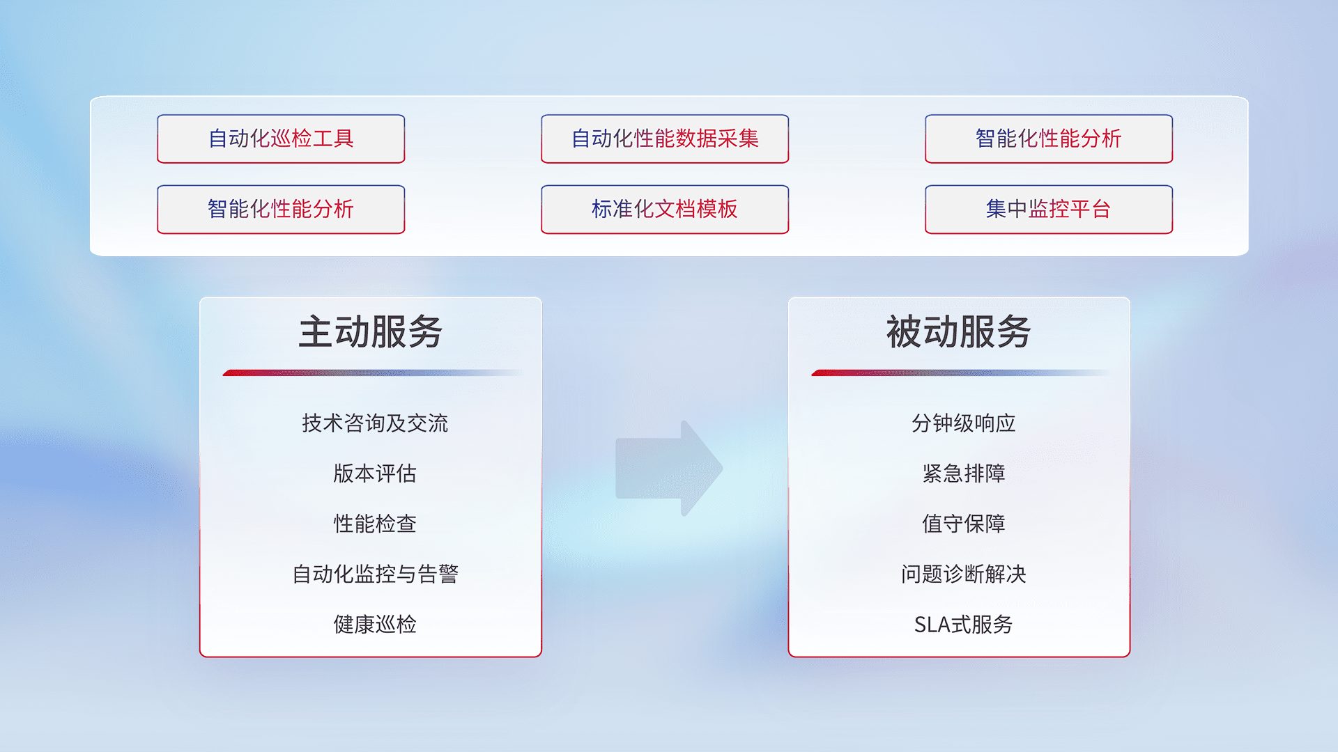 智能化工具和标准化文档,,保障服务质量,,,提供主动服务(包含技术咨询、、版本评估、、性能检查、、、、自动化监控与告警、、、健康巡检)和被动服务包含(分钟级响应、、、、紧急排障、、、、值守保障、、、问题诊断解决、、SLA服务)。。。